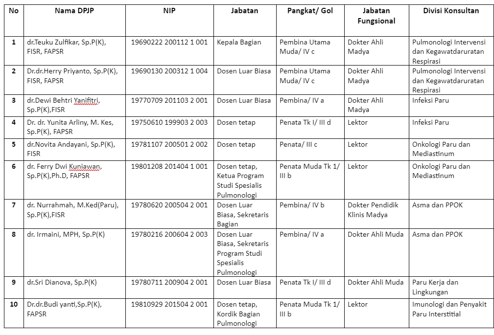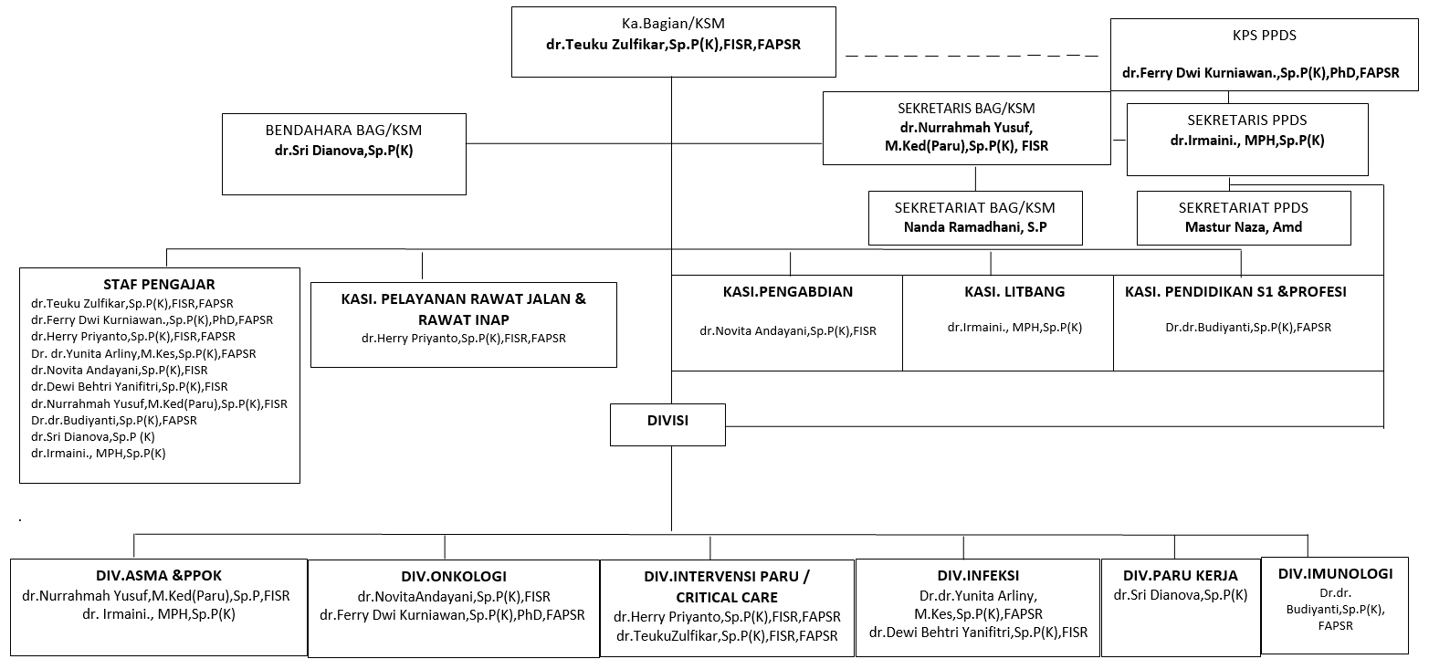 The development of Pulmonology in Aceh began with the return of Dr. T. Moead Zulkifli Sp.P from pulmonary specialist education from FKUI in 1987. At that time pulmonary services and education were integrated in the SMF / Internal Medicine Division. In 2003, pulmonary services and education were officially independent from the SMF/IPD Division based on the Decree of the Dean of FK Unsyiah and officially became one of the 17 divisions within the Unsyiah Faculty of Medicine.