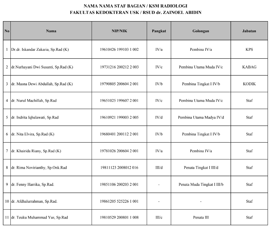 The Radiology Clinic Registrar's activities take 2 (two) weeks with a content of 2 credits where, young doctors conduct case discussions, case consultations, case presentations and guidance on the introduction of Radiology, Thorax, Musculoskeletal, Abdomen, Neuro Head and Neck and Pediatric Radiology. Young doctors who undergo Clerk of the Radiology Clinic are required to take the OSCE and CBT Exams in the second week (last week). The current teaching staff in the Radiology section include: