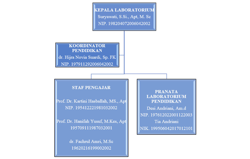 The pharmacology department is one of the preclinical departments that supports the improvement of academic abilities and skills of medical faculty students in terms of drug therapy. The teaching staff of this section are involved in teaching and learning activities in basic pharmacology and pharmacotherapy courses for first year and second year students. Pharmacology practicum is carried out under the coordination of the Biomedical Laboratory. The staff of the pharmacology department come from several different study focuses such as clinical pharmacology, experimental pharmacology with expertise in handling experimental animals and pharmacy. The organizational structure of the pharmacology section is as follows: