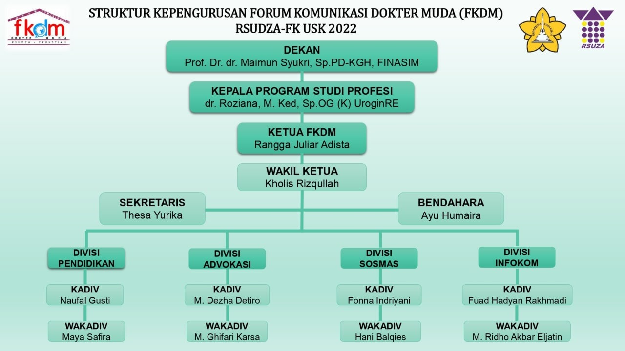 The Clinical Clerkship Communication Forum (FKDM) RSUDZA-FK USK is a forum for socialization, information media, and discussion forums for Clinical Clerkship colleagues who carry out professional medical education at RSUDZA Banda Aceh. The establishment of FKDM is intended as a bridge between the dean of FK USK and all clinical clerkship in conveying aspirations, constructive criticism, and problems faced during professional medical education at RSUDZA Banda Aceh. For the daily management of FKDM, they are appointed from USK FK medical students who have obtained medical degrees.